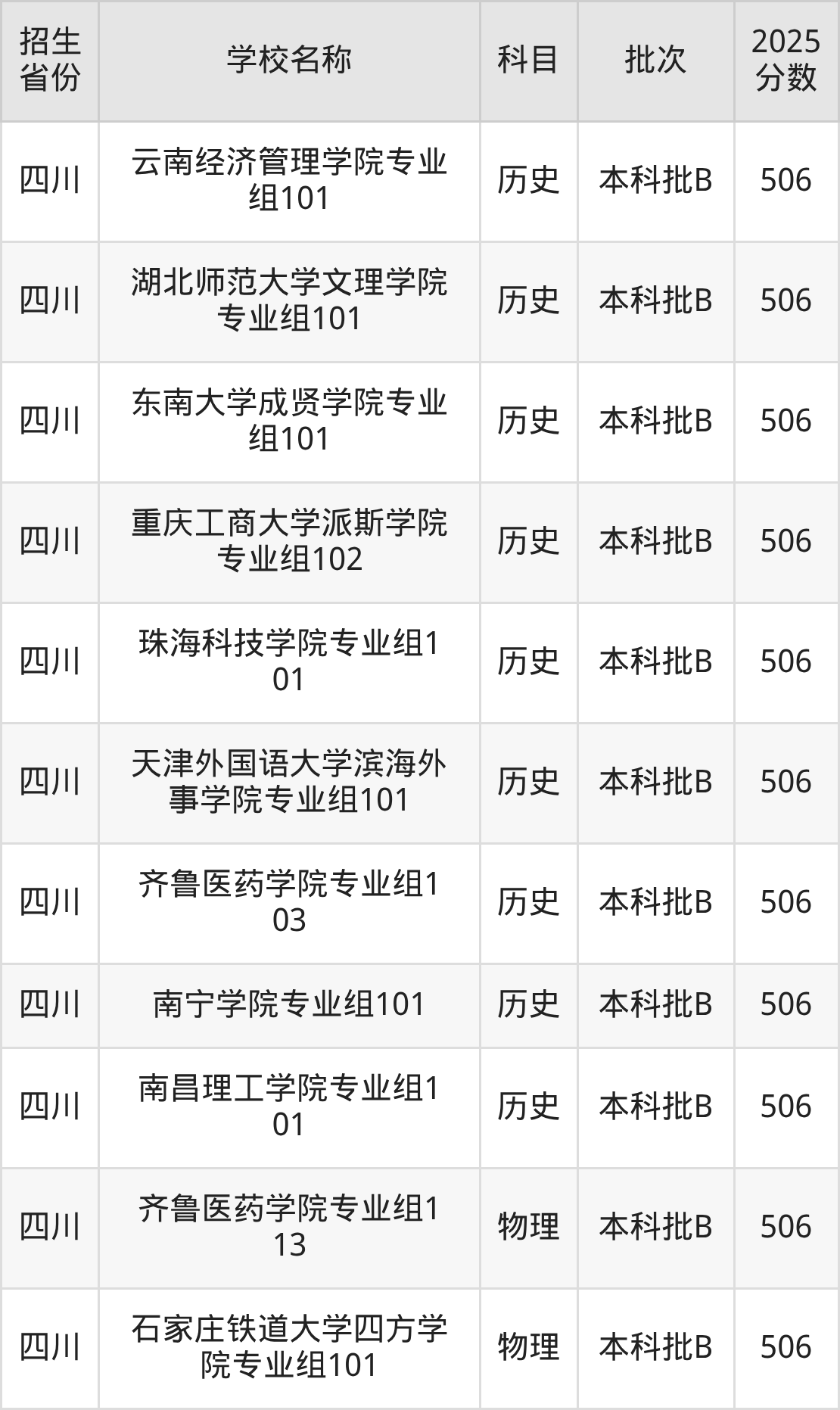 四川省歷史組分?jǐn)?shù)線是506分的二本民辦大學(xué)有:云南經(jīng)濟(jì)管理學(xué)院、湖北師范大學(xué)文理學(xué)院、東南大學(xué)成賢學(xué)院、重慶工商大學(xué)派斯學(xué)院、珠海科技學(xué)院、天津外國語大學(xué)濱海外事學(xué)院、齊魯醫(yī)藥學(xué)院、南寧學(xué)院、南昌理工學(xué)院。