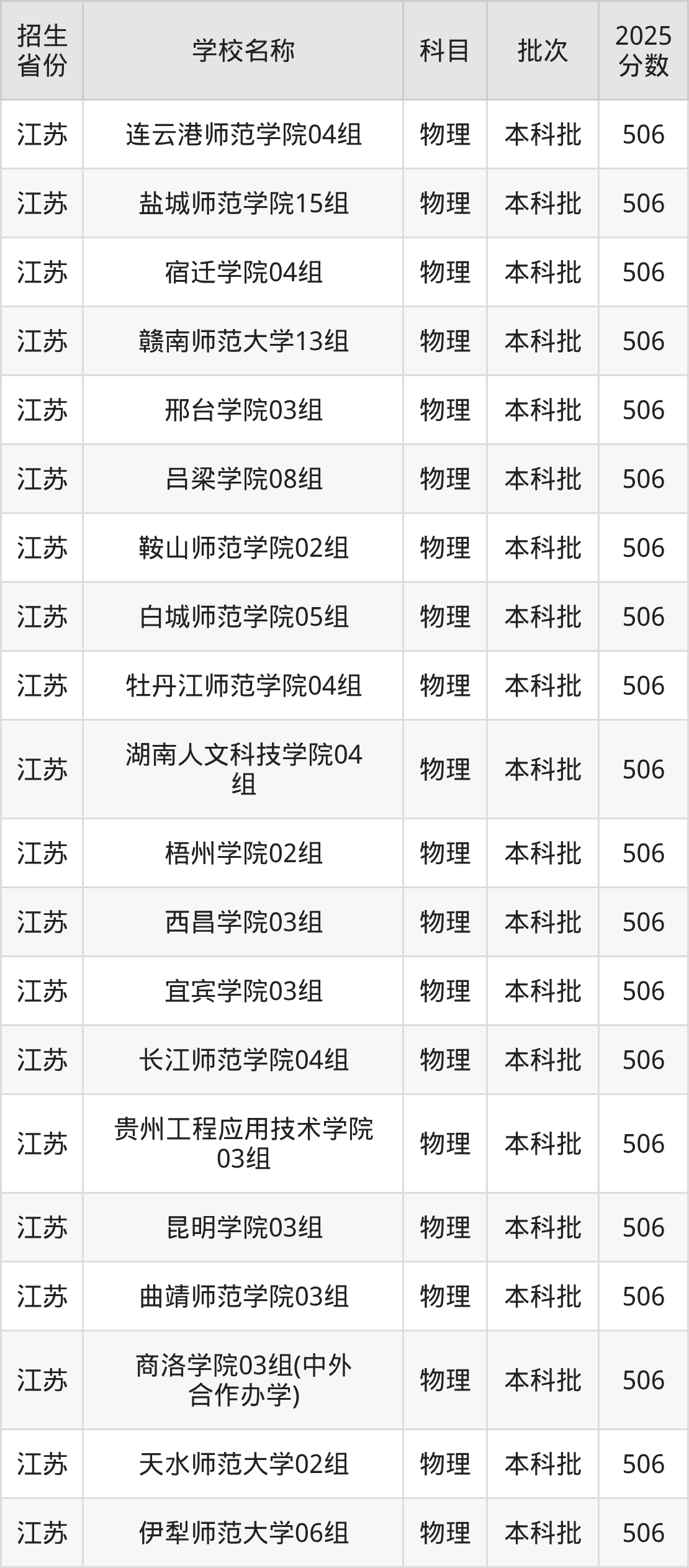 江蘇省物理組分?jǐn)?shù)線是506分的文科大學(xué)有:連云港師范學(xué)院、鹽城師范學(xué)院、宿遷學(xué)院、贛南師范大學(xué)、邢臺學(xué)院、呂梁學(xué)院、鞍山師范學(xué)院、白城師范學(xué)院、牡丹江師范學(xué)院、湖南人文科技學(xué)院。
