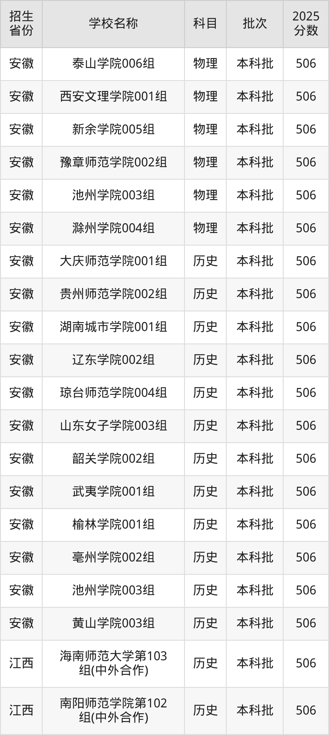 安徽省歷史組分?jǐn)?shù)線是506分的文科大學(xué)有:大慶師范學(xué)院、貴州師范學(xué)院、湖南城市學(xué)院、遼東學(xué)院、瓊臺師范學(xué)院、山東女子學(xué)院、韶關(guān)學(xué)院、武夷學(xué)院、榆林大學(xué)、亳州學(xué)院。