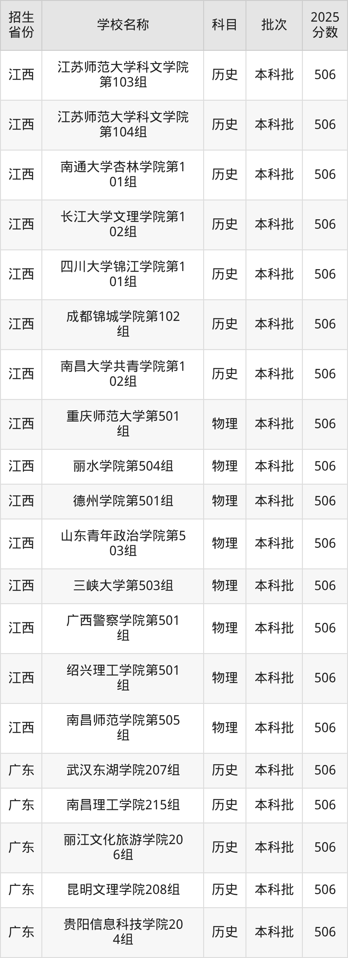 江西省物理組分?jǐn)?shù)線是506分的文科大學(xué)有:重慶師范大學(xué)、麗水學(xué)院、德州學(xué)院、山東青年政治學(xué)院、三峽大學(xué)、廣西警察學(xué)院、紹興理工學(xué)院、南昌師范學(xué)院。