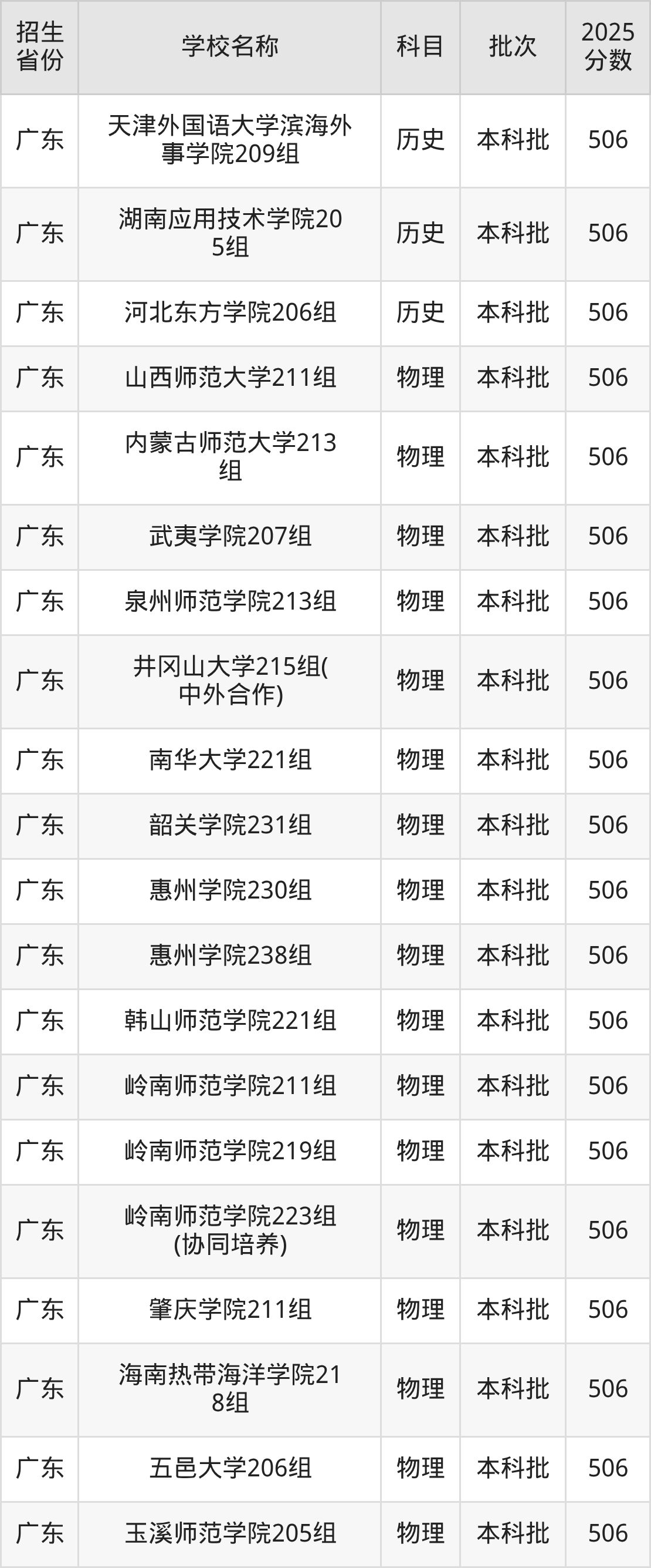 廣東省物理組分?jǐn)?shù)線是506分的文科大學(xué)有:山西師范大學(xué)、內(nèi)蒙古師范大學(xué)、武夷學(xué)院、泉州師范學(xué)院、井岡山大學(xué)、南華大學(xué)、韶關(guān)學(xué)院、惠州學(xué)院、韓山師范學(xué)院、嶺南師范學(xué)院。