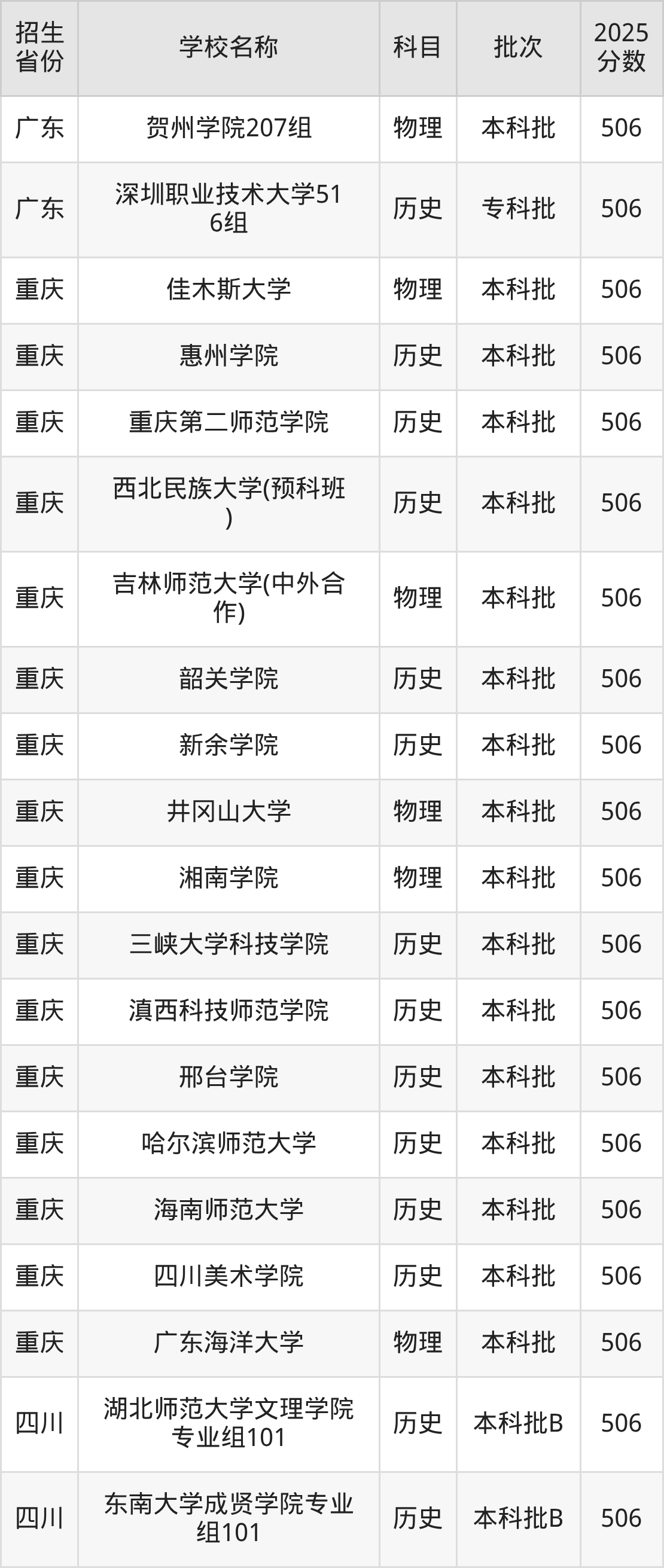 重慶市歷史組分?jǐn)?shù)線是506分的文科大學(xué)有:惠州學(xué)院、重慶第二師范學(xué)院、西北民族大學(xué)(預(yù)科班)、韶關(guān)學(xué)院、新余學(xué)院、三峽大學(xué)科技學(xué)院、滇西科技師范學(xué)院、邢臺學(xué)院、哈爾濱師范大學(xué)、海南師范大學(xué)。