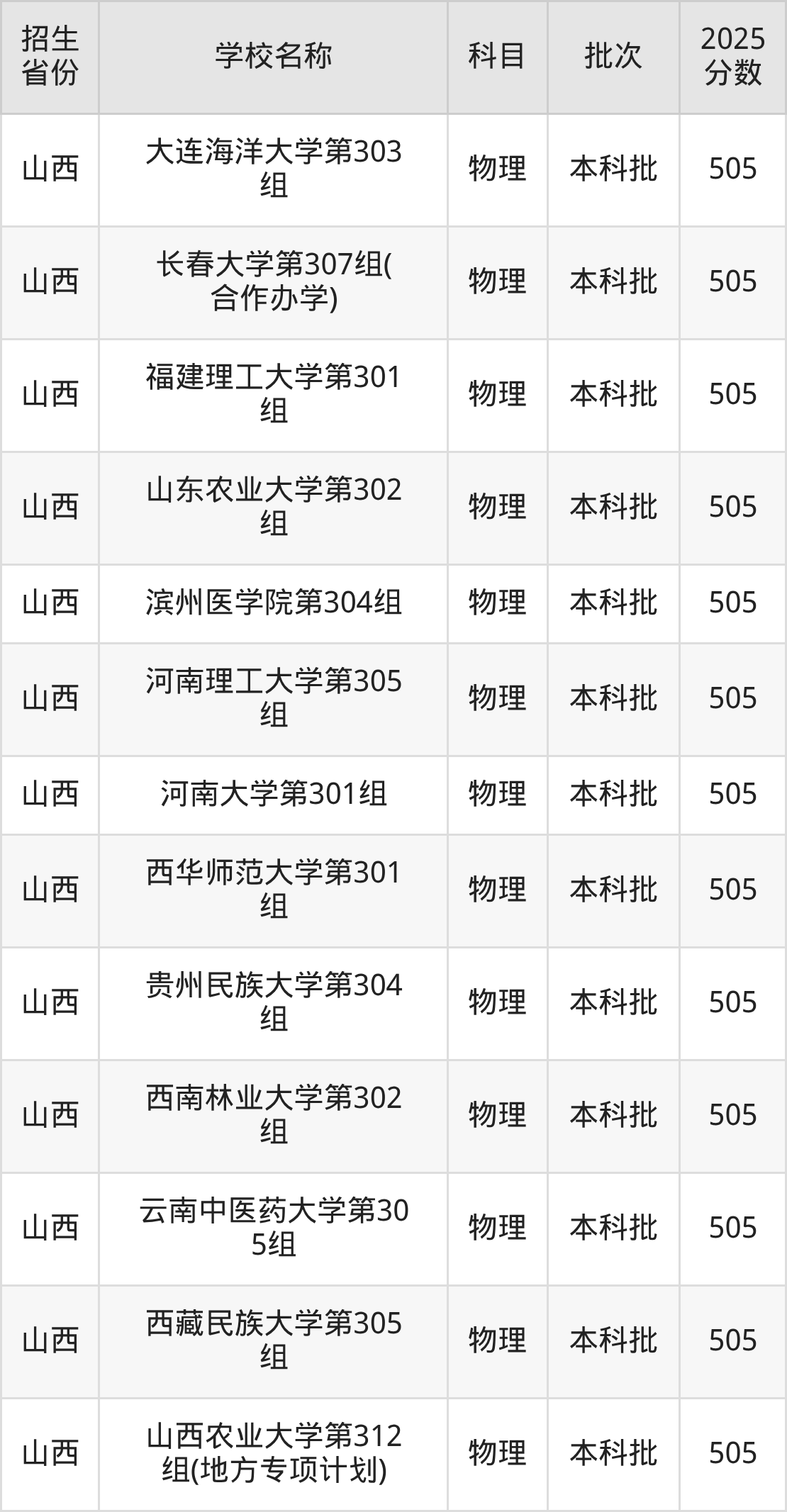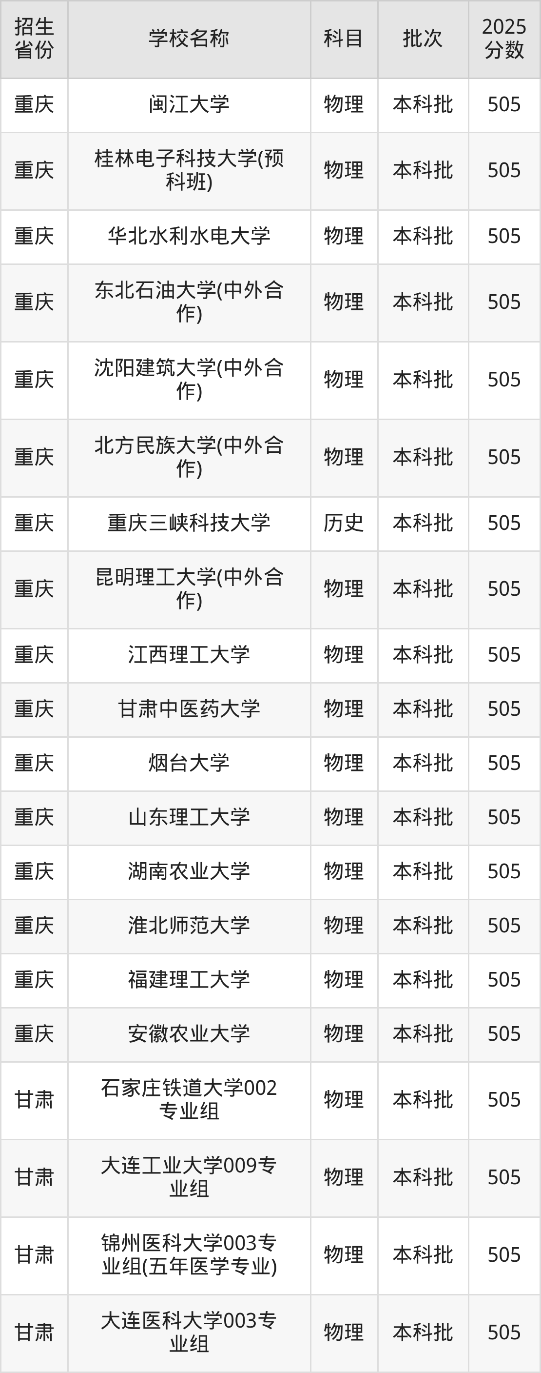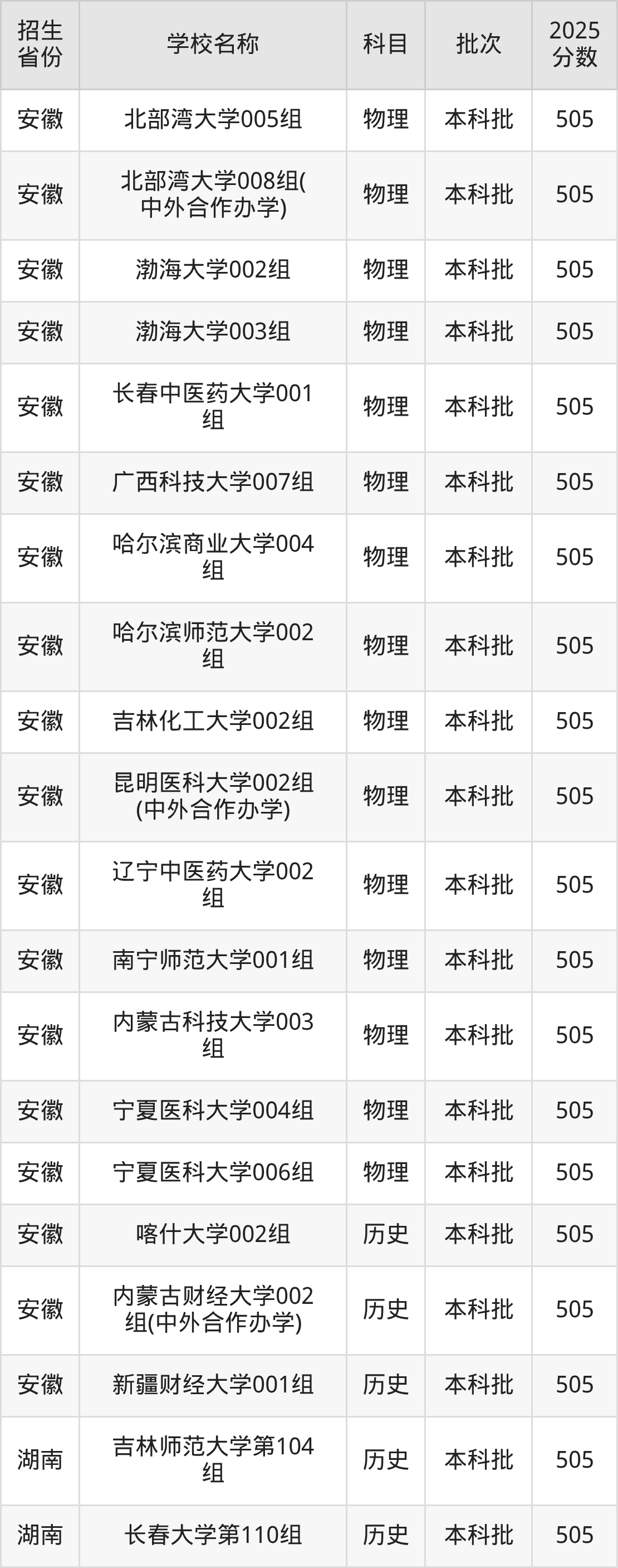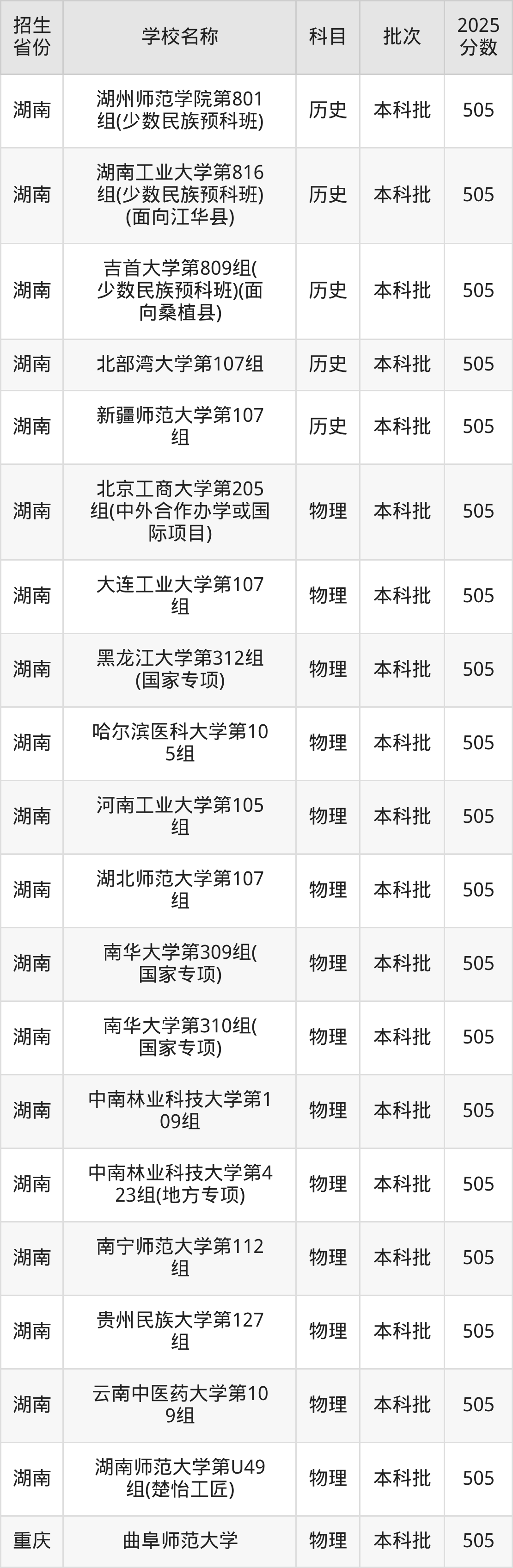 篩選全國(guó)各省2025年錄取分?jǐn)?shù)線為505分的一本大學(xué)如下: