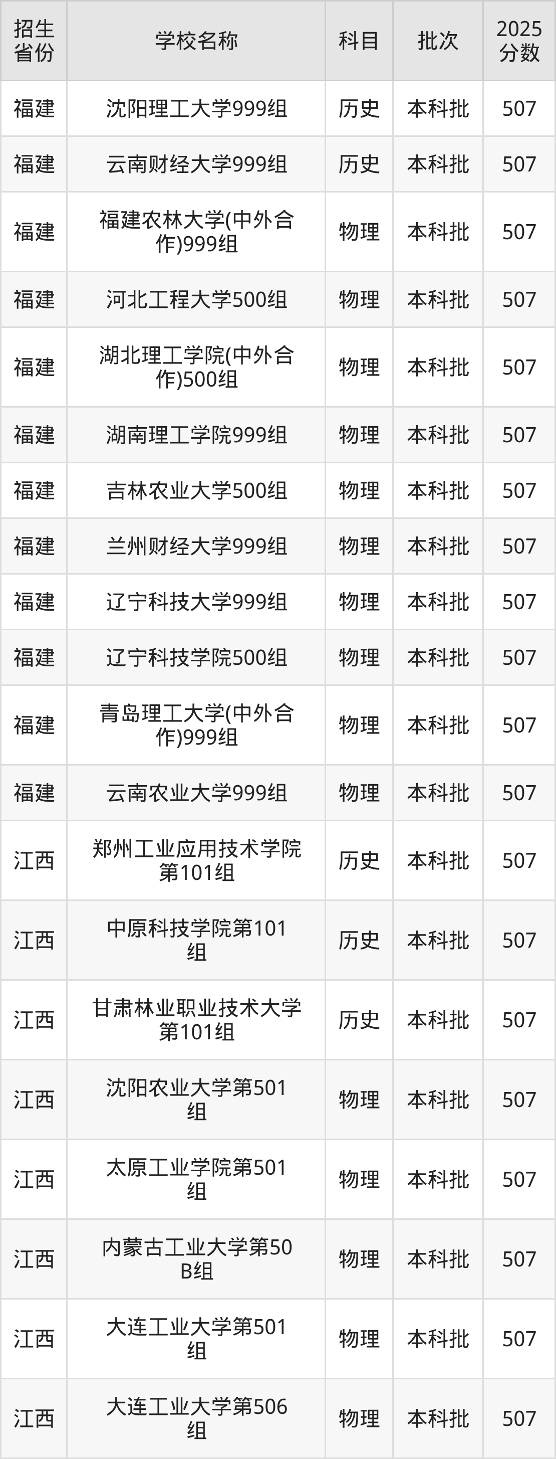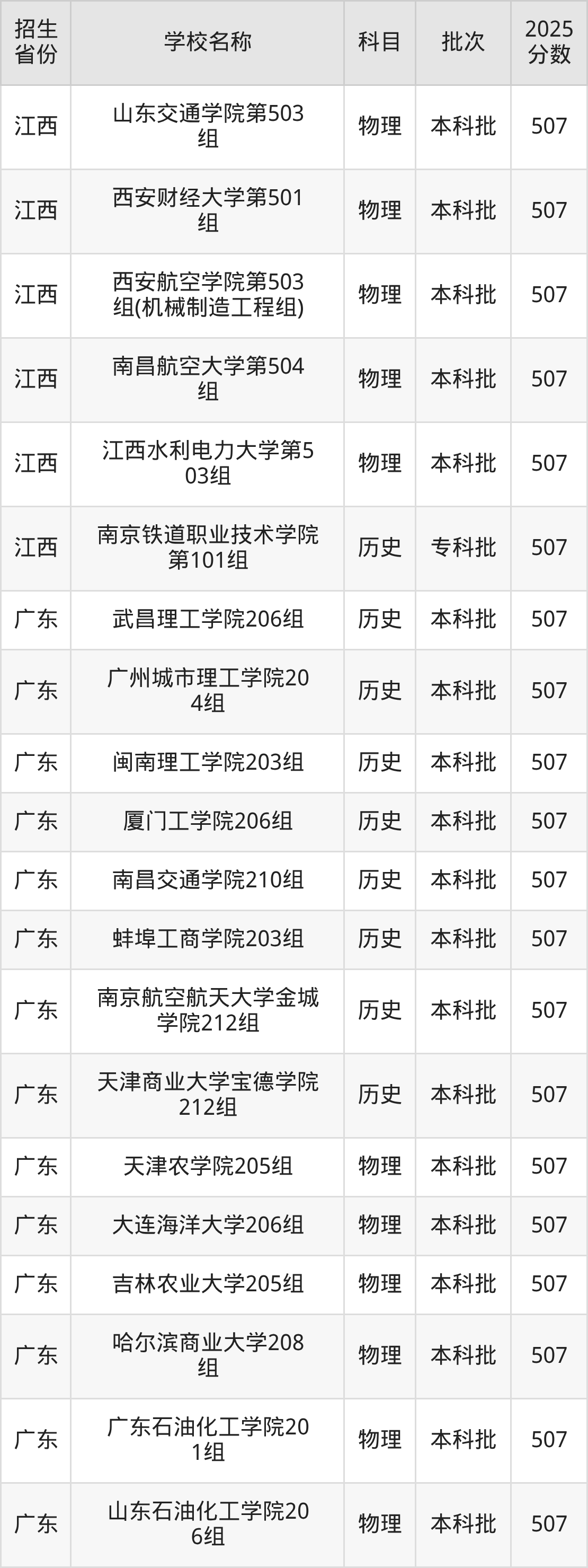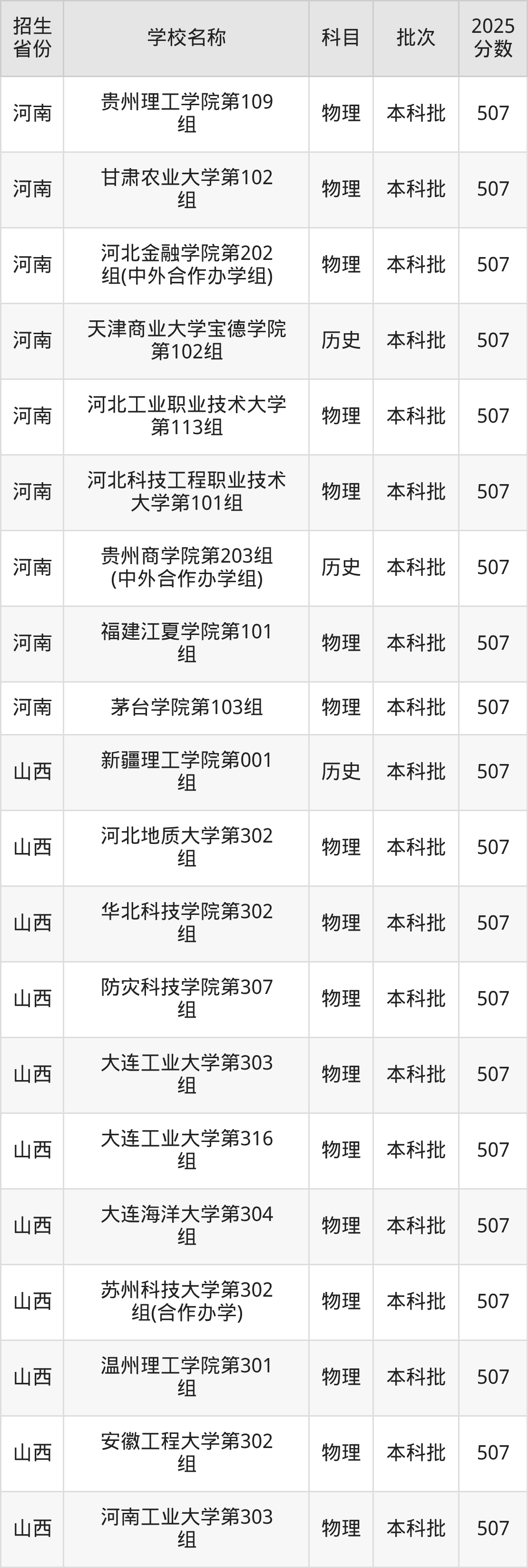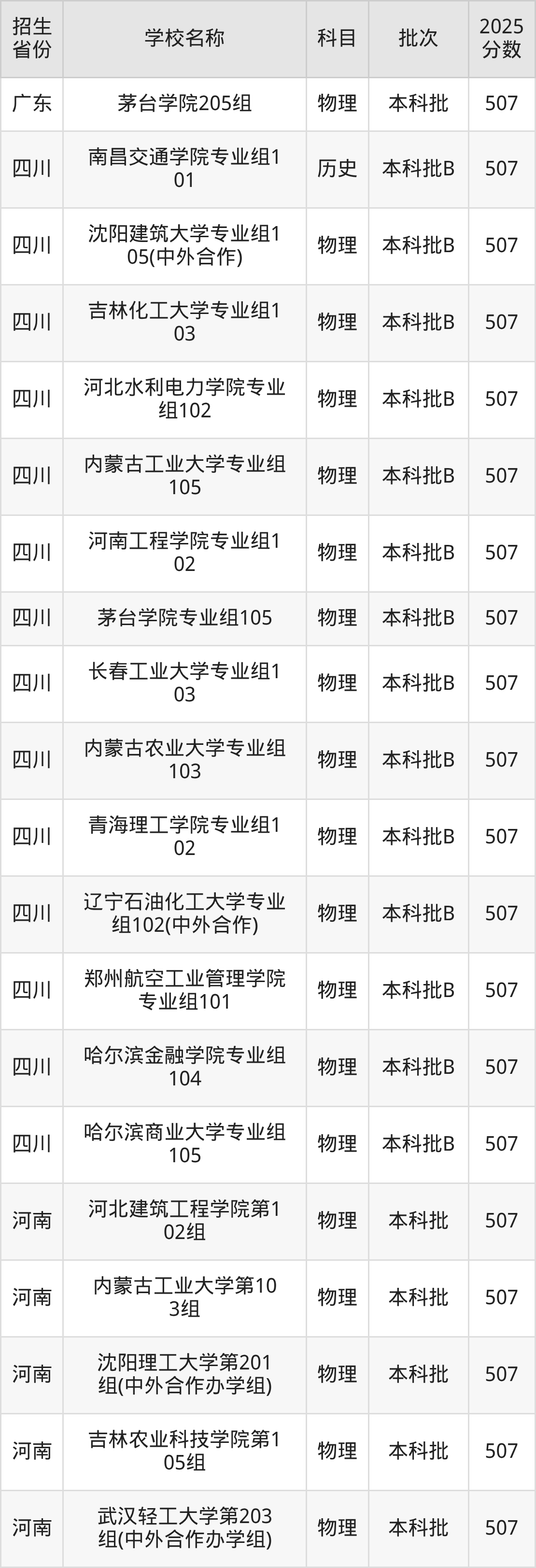 篩選全國各省2025年錄取分?jǐn)?shù)線為507分的理科大學(xué)如下: