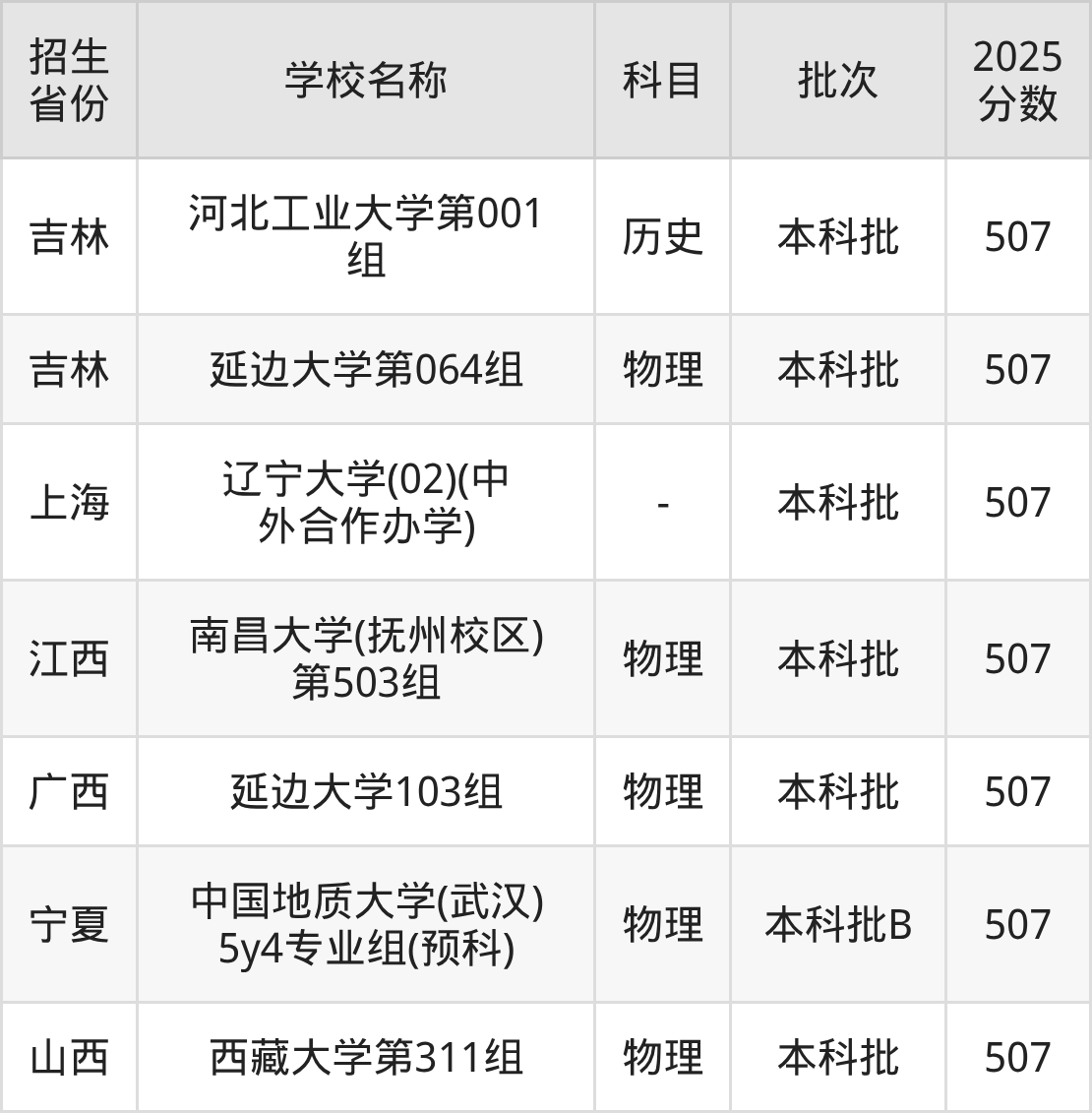 篩選全國(guó)各省2025年錄取分?jǐn)?shù)線(xiàn)為507分的211大學(xué)如下: