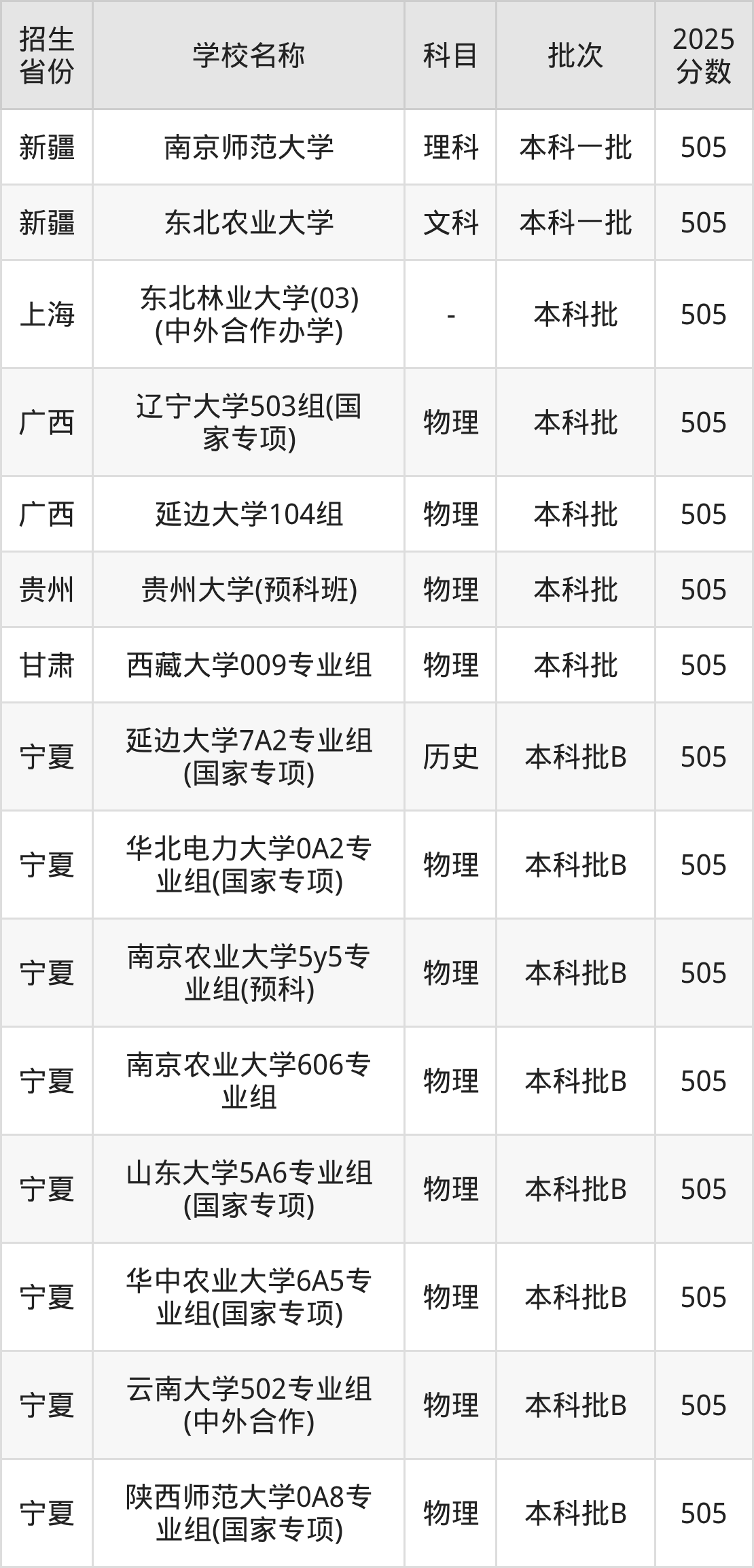 篩選全國各省2025年錄取分?jǐn)?shù)線為505分的211大學(xué)如下: