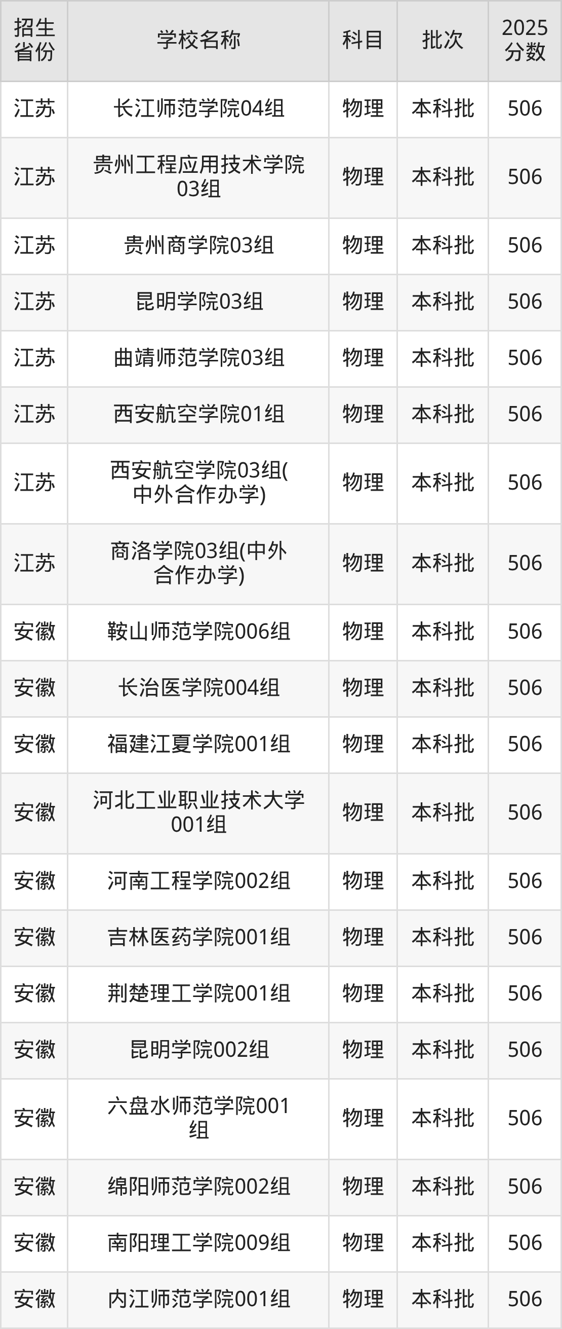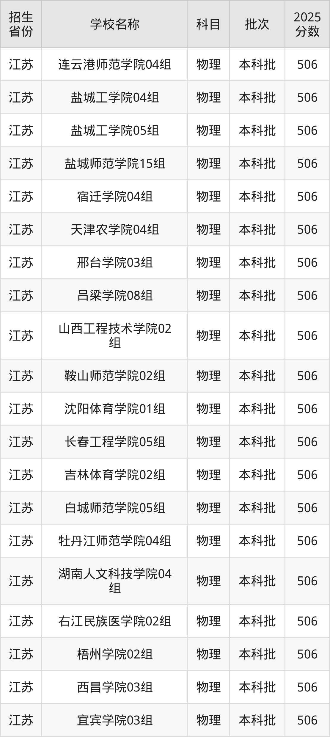 江蘇省物理組分?jǐn)?shù)線是506分的二本公辦大學(xué)有:連云港師范學(xué)院、鹽城工學(xué)院、鹽城師范學(xué)院、宿遷學(xué)院、天津農(nóng)學(xué)院、邢臺學(xué)院、呂梁學(xué)院、山西工程技術(shù)學(xué)院、鞍山師范學(xué)院、沈陽體育學(xué)院。
