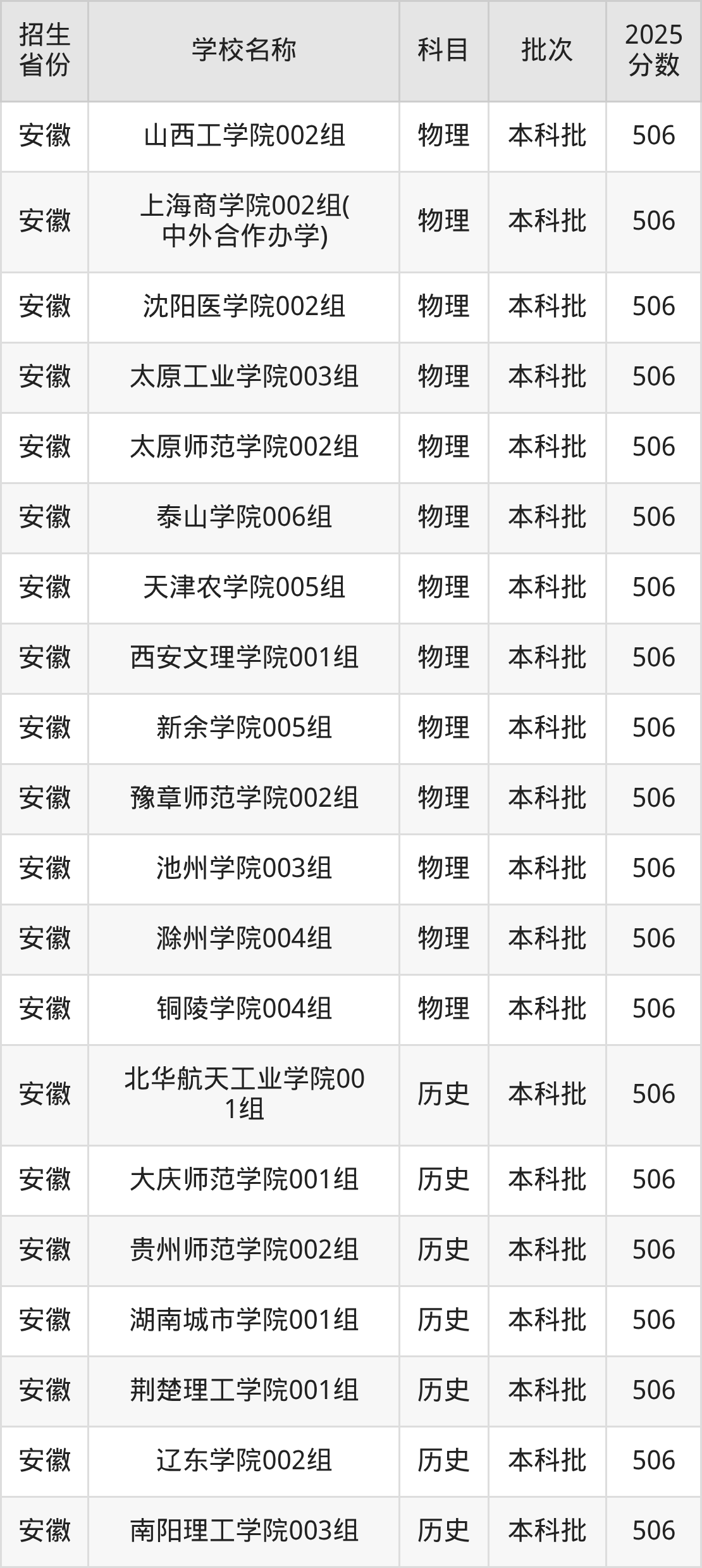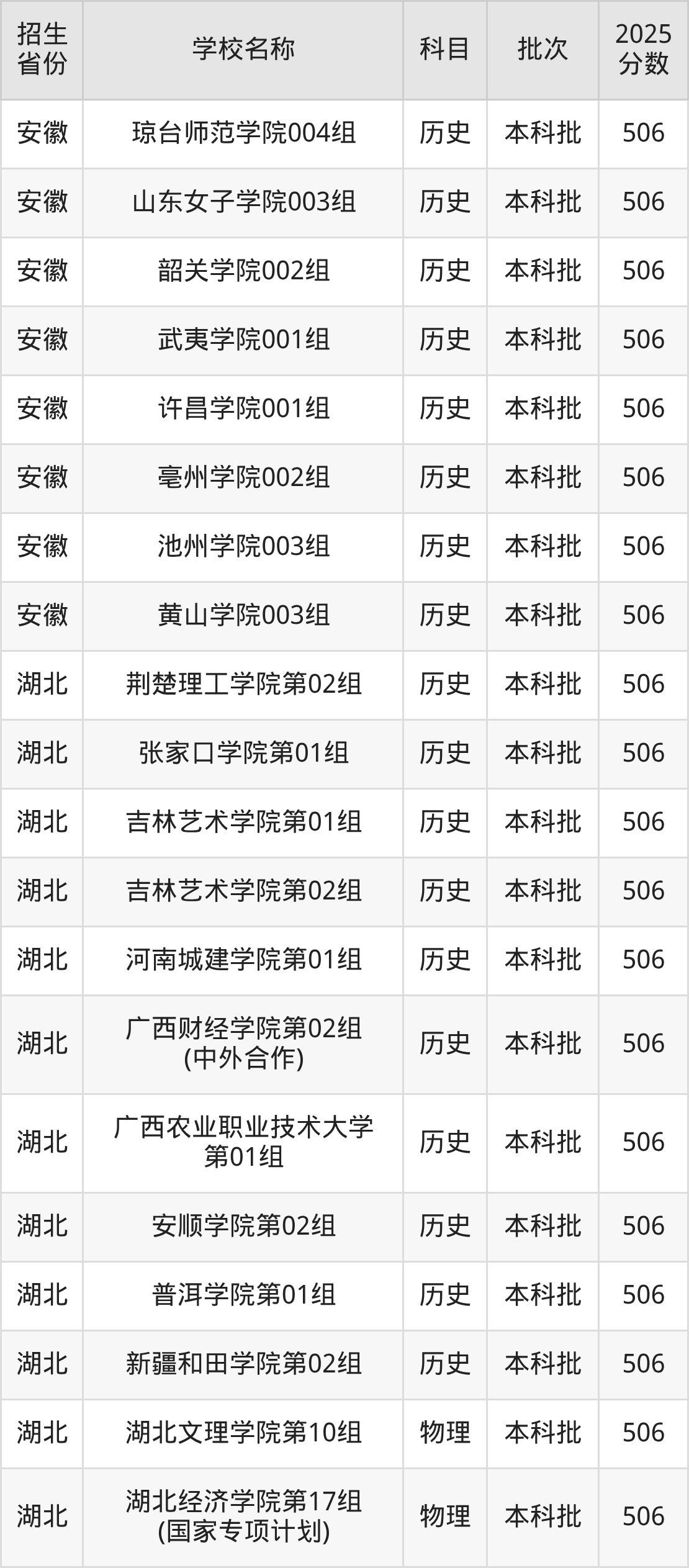 安徽省歷史組分?jǐn)?shù)線是506分的二本公辦大學(xué)有:北華航天工業(yè)學(xué)院、大慶師范學(xué)院、貴州師范學(xué)院、湖南城市學(xué)院、荊楚理工學(xué)院、遼東學(xué)院、南陽理工學(xué)院、瓊臺師范學(xué)院、山東女子學(xué)院、韶關(guān)學(xué)院。