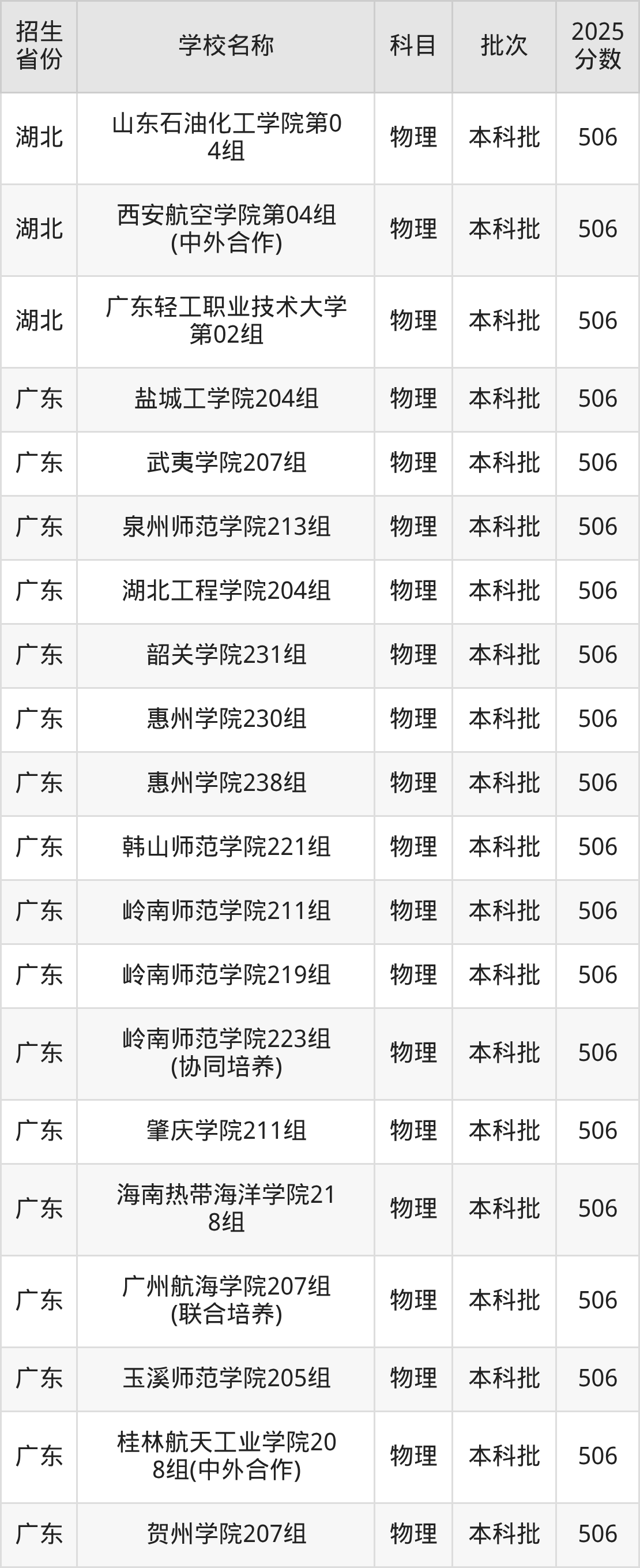 廣東省物理組分?jǐn)?shù)線是506分的二本公辦大學(xué)有:鹽城工學(xué)院、武夷學(xué)院、泉州師范學(xué)院、湖北工程學(xué)院、韶關(guān)學(xué)院、惠州學(xué)院、韓山師范學(xué)院、嶺南師范學(xué)院、肇慶學(xué)院、海南熱帶海洋學(xué)院。