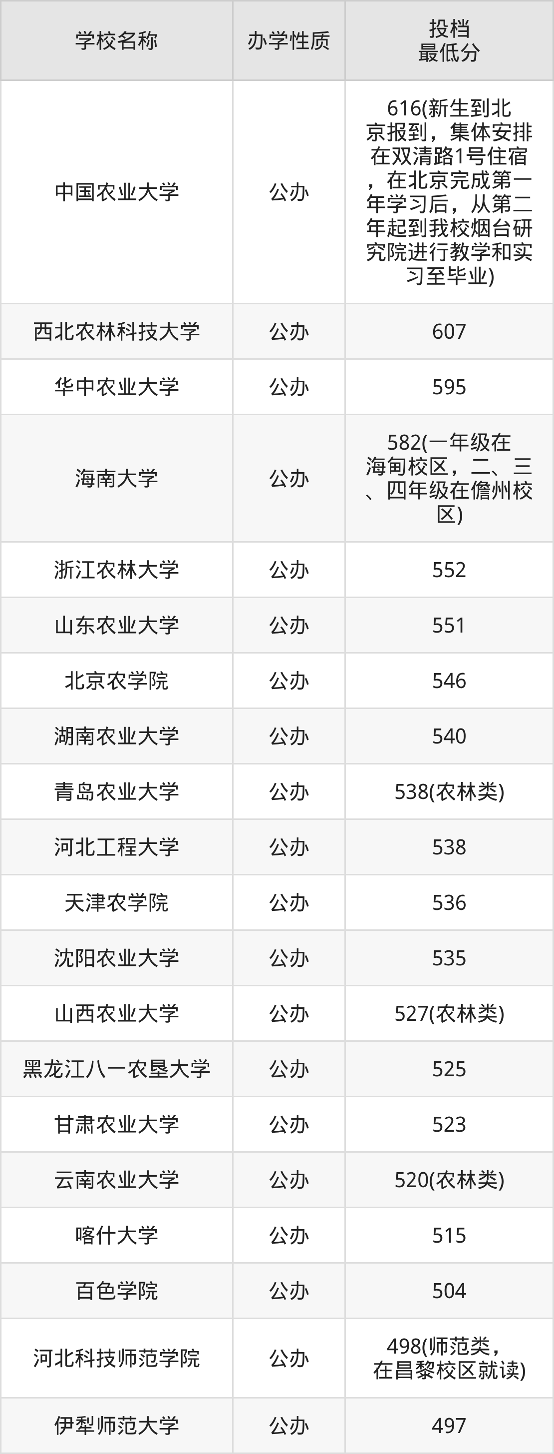 分?jǐn)?shù)線第一名是:中國農(nóng)業(yè)大學(xué)(新生到北京報(bào)到,集體安排在雙清路1號(hào)住宿,在北京完成第一年學(xué)習(xí)后,從第二年起到我校煙臺(tái)研究院進(jìn)行教學(xué)和實(shí)習(xí)至畢業(yè)),616分。