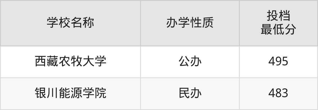 分?jǐn)?shù)線最低、最好考的是銀川能源學(xué)院,學(xué)校設(shè)施農(nóng)業(yè)科學(xué)與工程最低分是483,超本科線24分,不過這所學(xué)校是民辦性質(zhì)。2025公辦大學(xué)最低分是495,收分最低的學(xué)校是西藏農(nóng)牧大學(xué),超本科線36分能上。