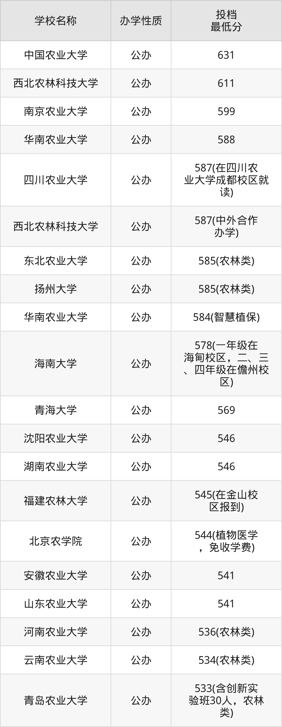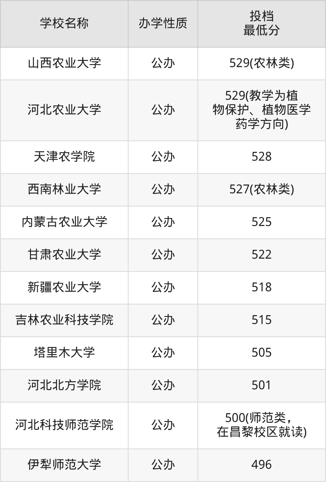 另外分數(shù)線比較低的大學還有河北科技師范學院(500分)、河北北方學院(501分)、塔里木大學(505分)、吉林農(nóng)業(yè)科技學院(515分)、新疆農(nóng)業(yè)大學(518分)等。