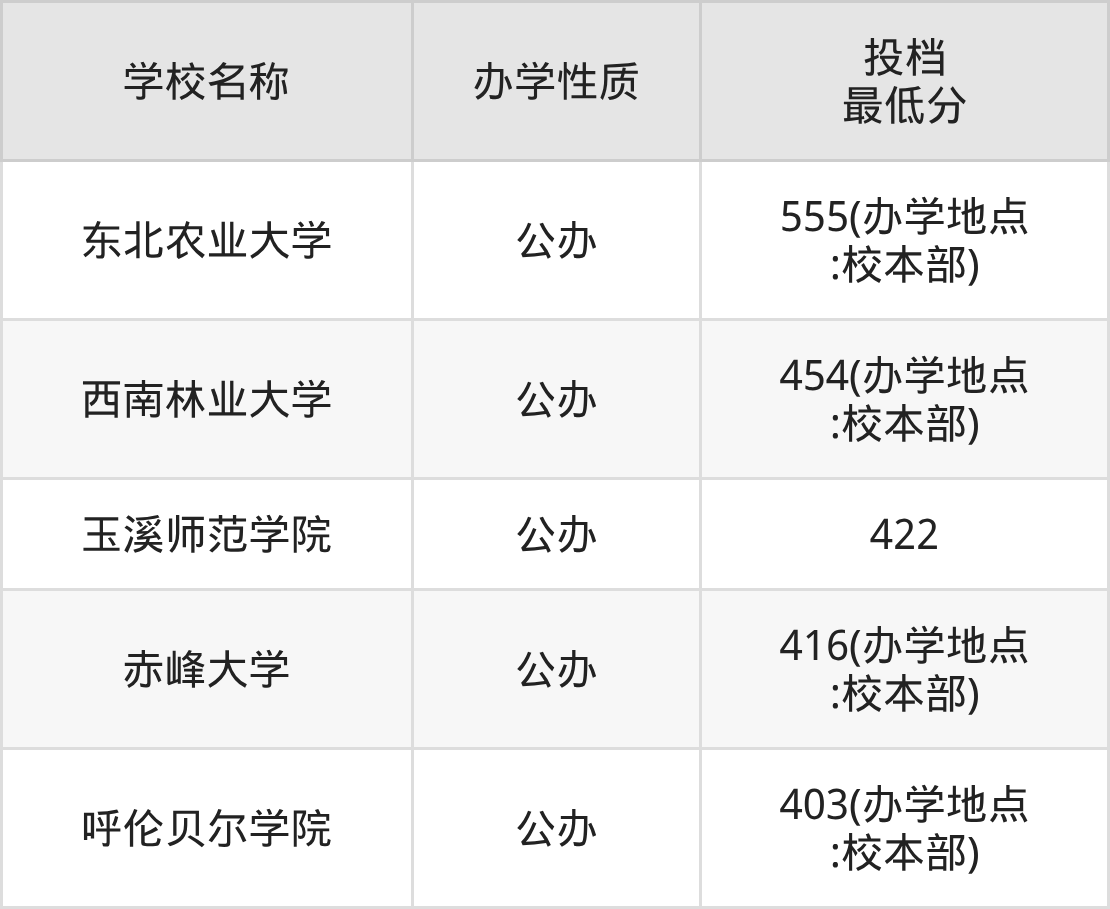 分?jǐn)?shù)線最低、最好考的是呼倫貝爾學(xué)院,學(xué)校應(yīng)用生物科學(xué)最低分是403,超本科線28分,該校也是同學(xué)們最容易考上的公辦大學(xué)。