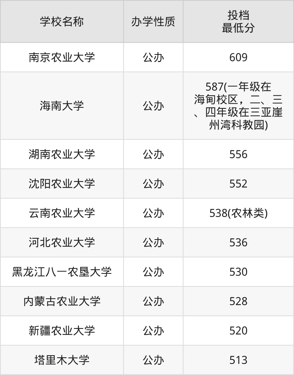 另外分數(shù)線比較低的大學(xué)還有新疆農(nóng)業(yè)大學(xué)(520分)、內(nèi)蒙古農(nóng)業(yè)大學(xué)(528分)、黑龍江八一農(nóng)墾大學(xué)(530分)、河北農(nóng)業(yè)大學(xué)(536分)等。